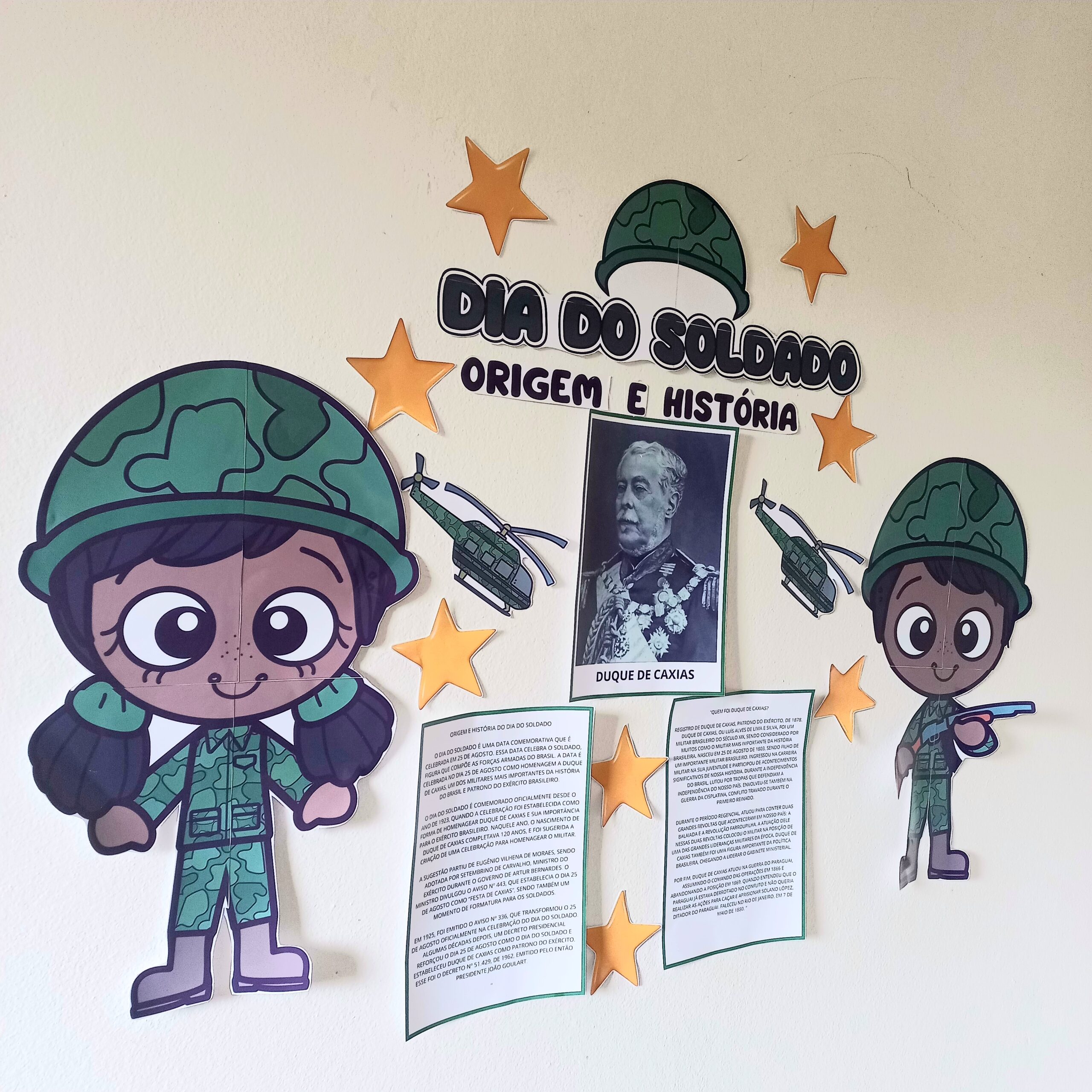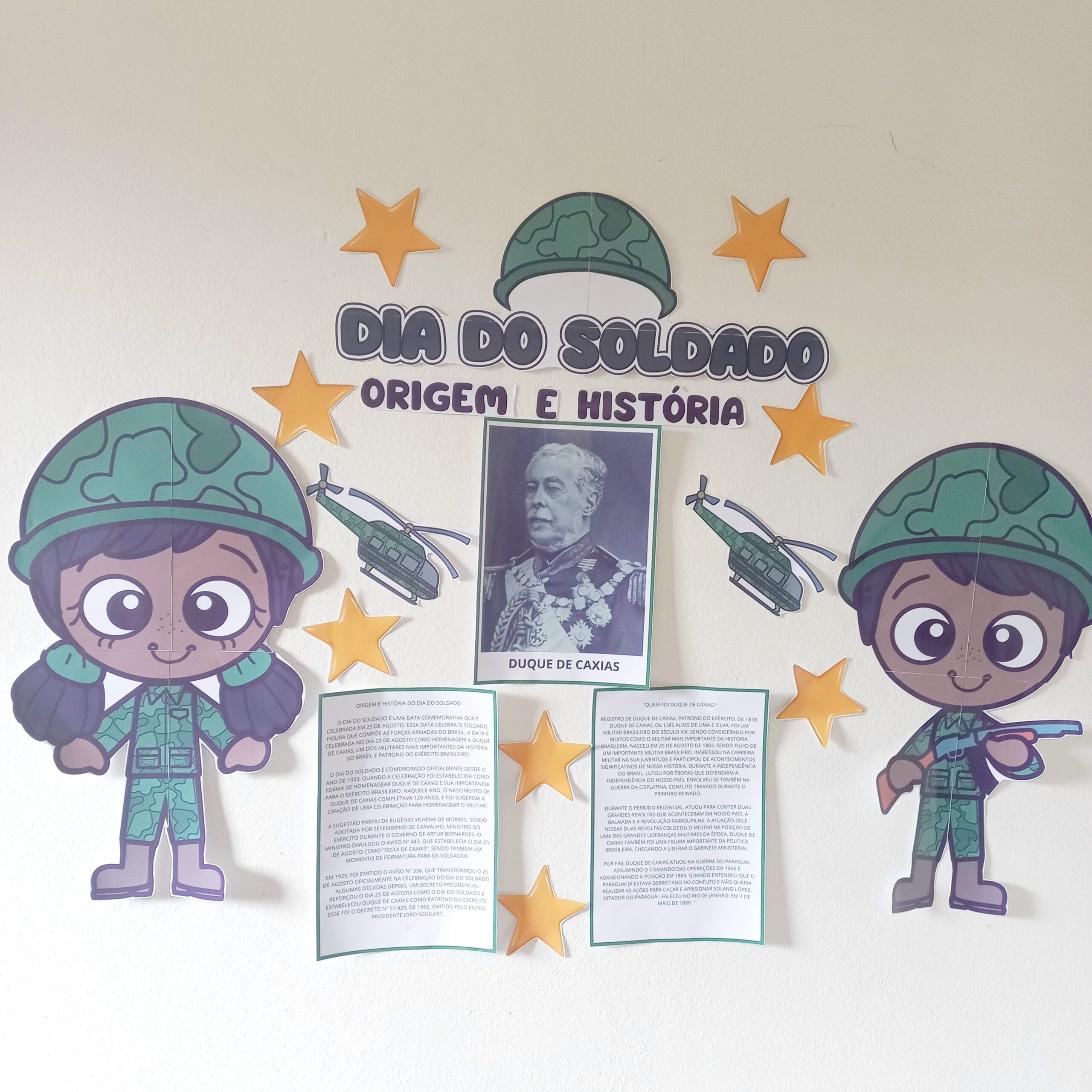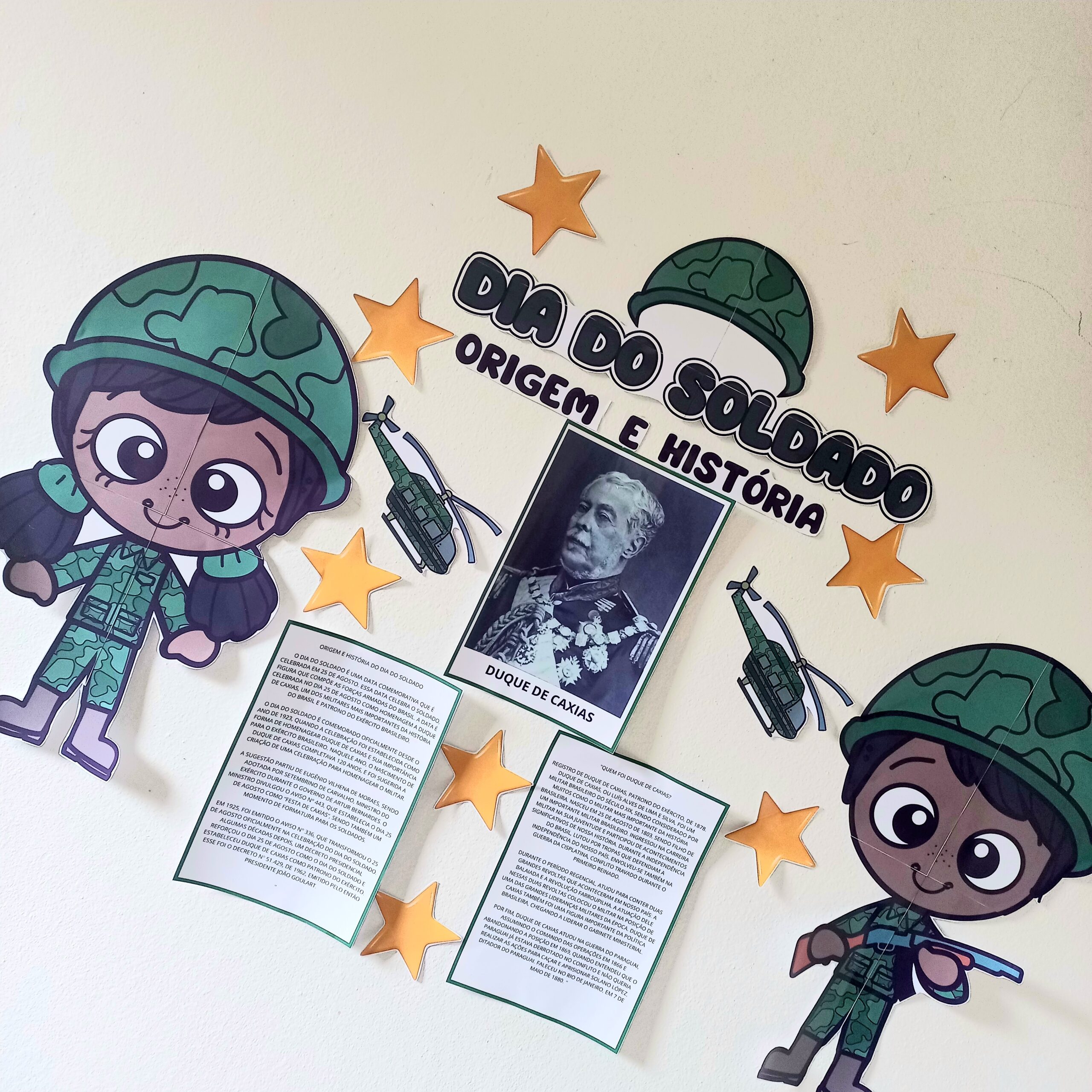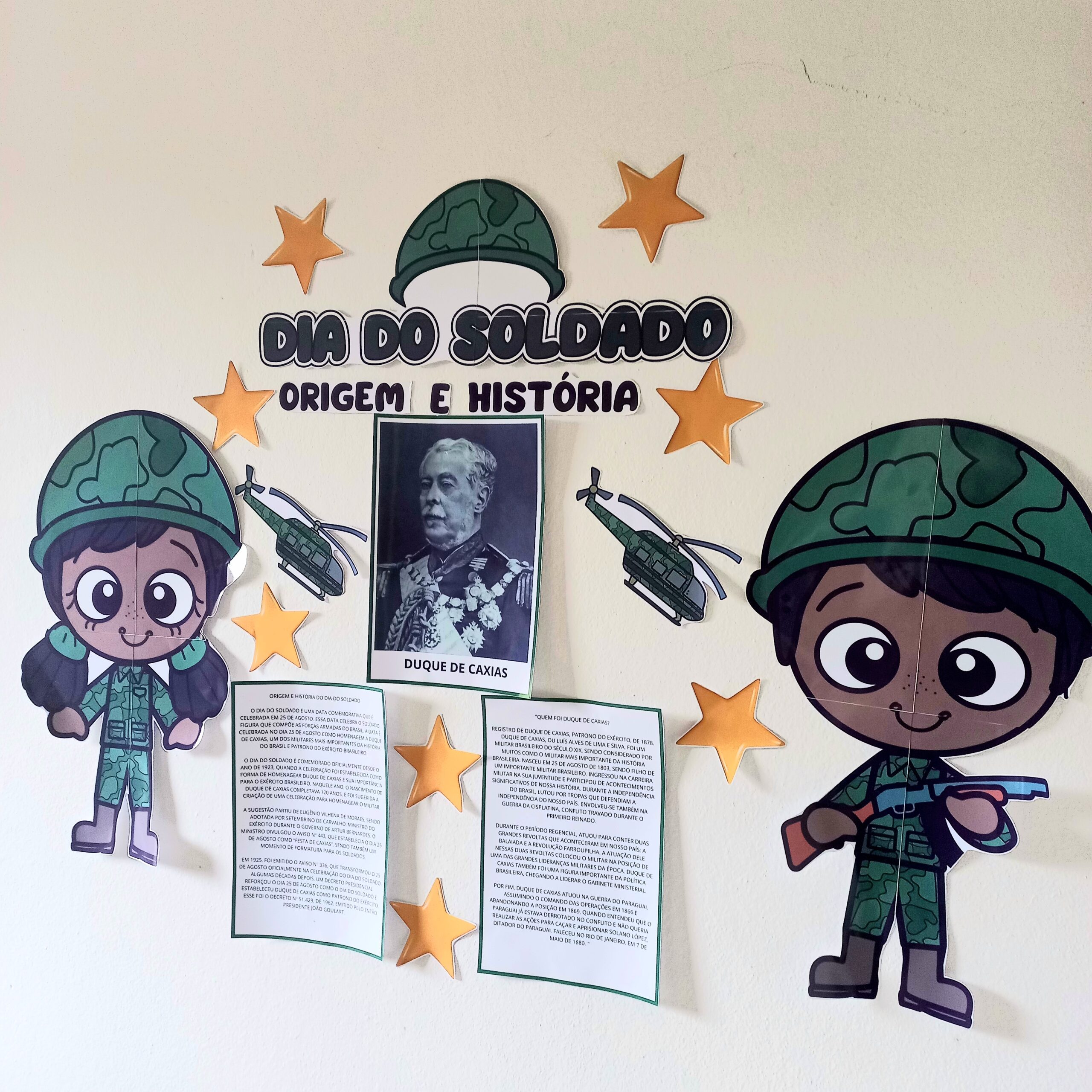 💜Elementos para compor o painel 💚Foto Duque de Caxias 💙Texto sobre quem foi Duque de Caxias 💚História sobre o dia do soldado 💙medidas:0,94 de altura 1,16 de altura