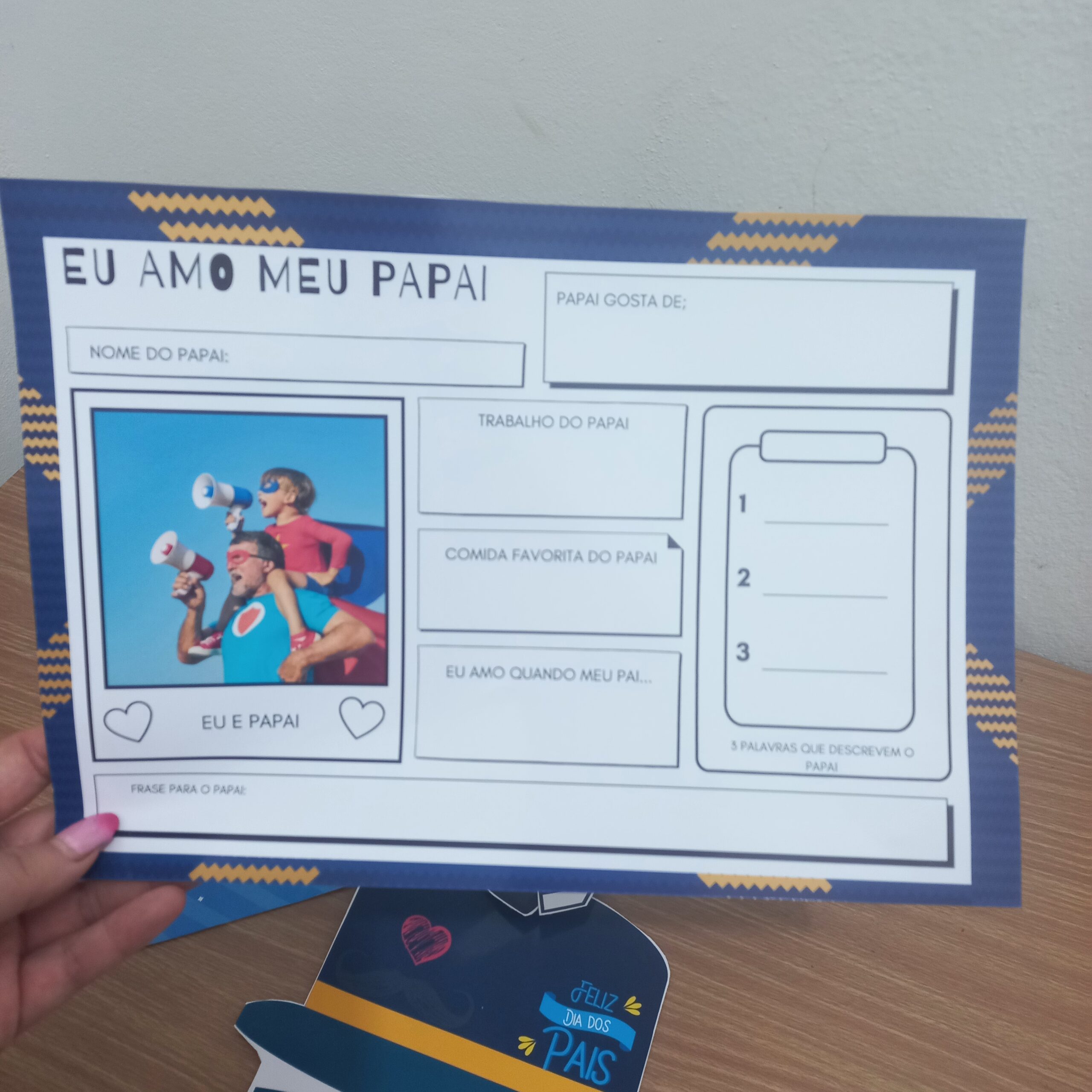 Painel dia pais 🩵Lembrancinhas dia dos pais: 🔷Ficha do papai para colocar foto 🔷Retrato para a criança fazer a caricatura do papai 🔷Máscara do papai 🔷Gravatinhas recados 🔷Coroas papai é meu herói para pintar