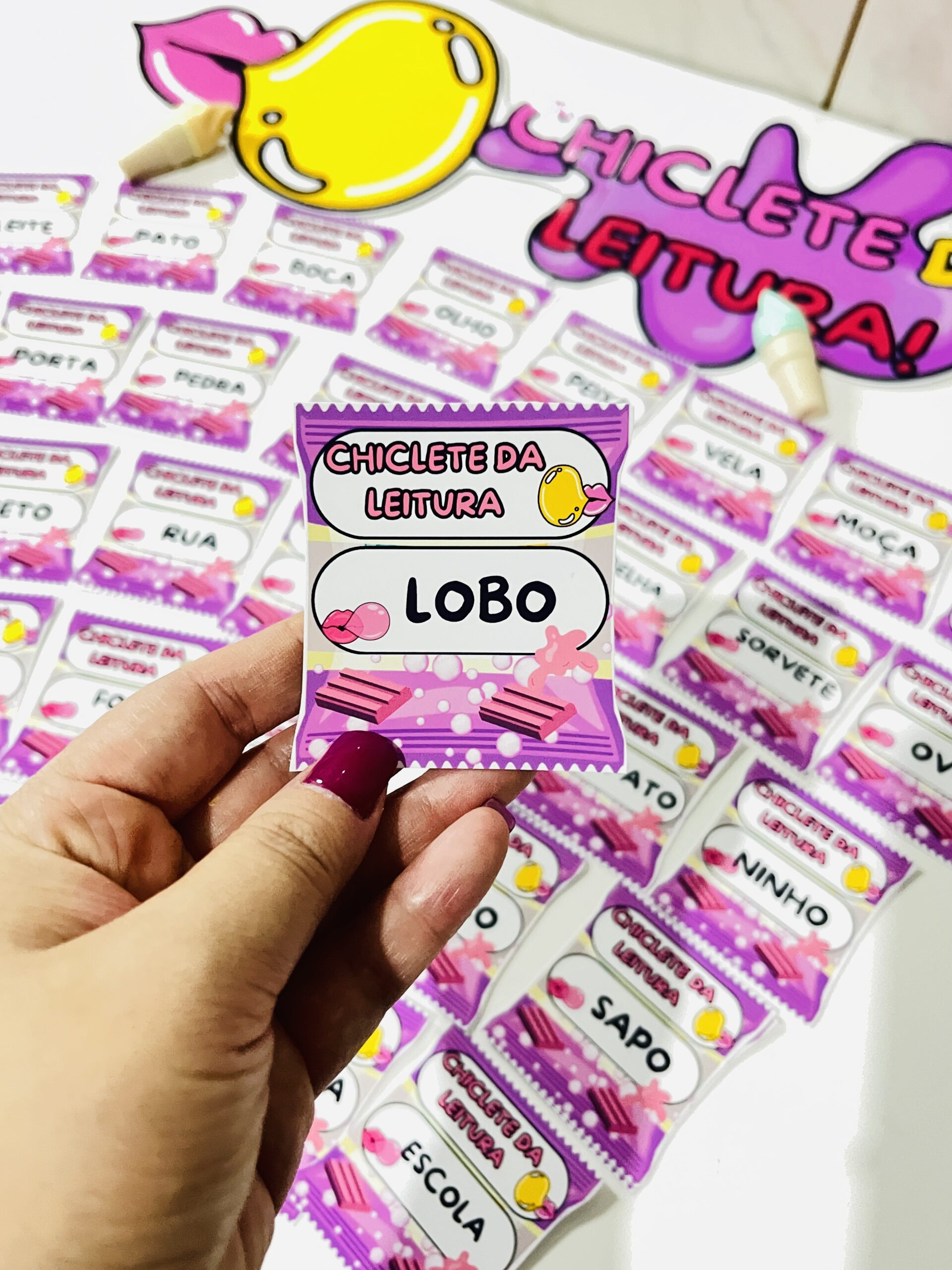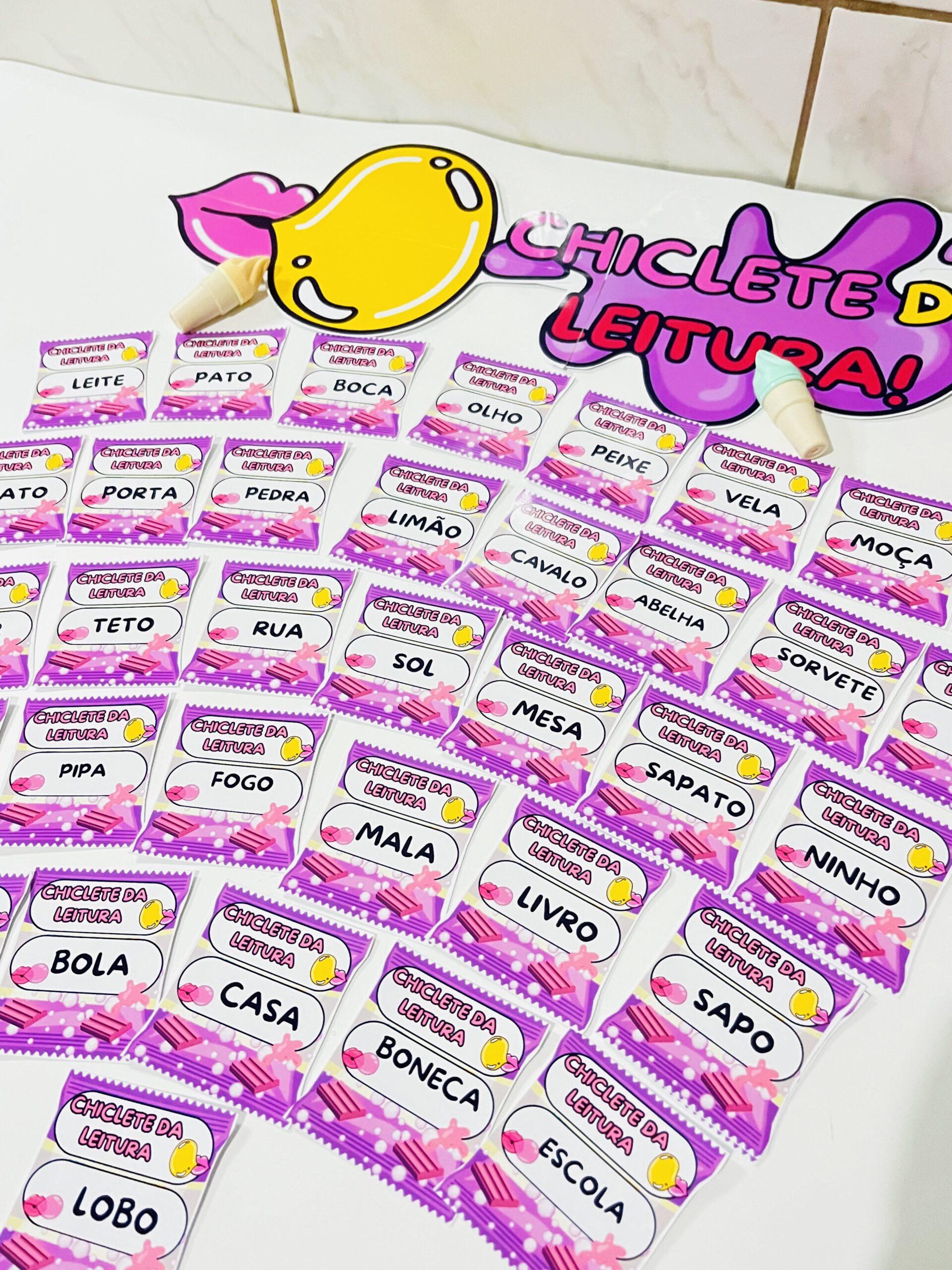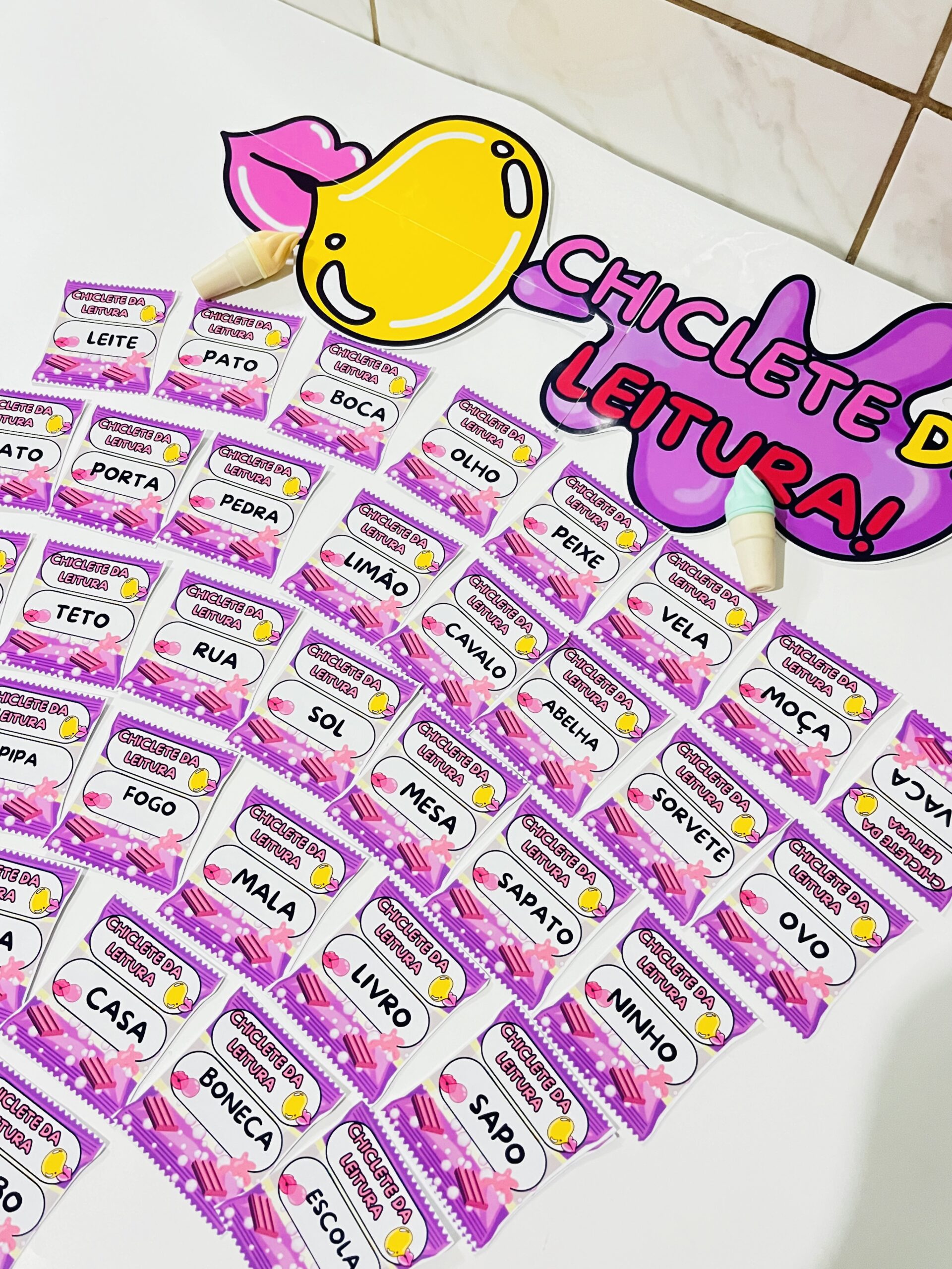 O Chiclete da Leitura é um arquivo pedagógico criativo com 30 palavrinhas essenciais, cada uma apresentada em um chiclete colorido, pensado para encantar, motivar e estimular a leitura das crianças 🌈