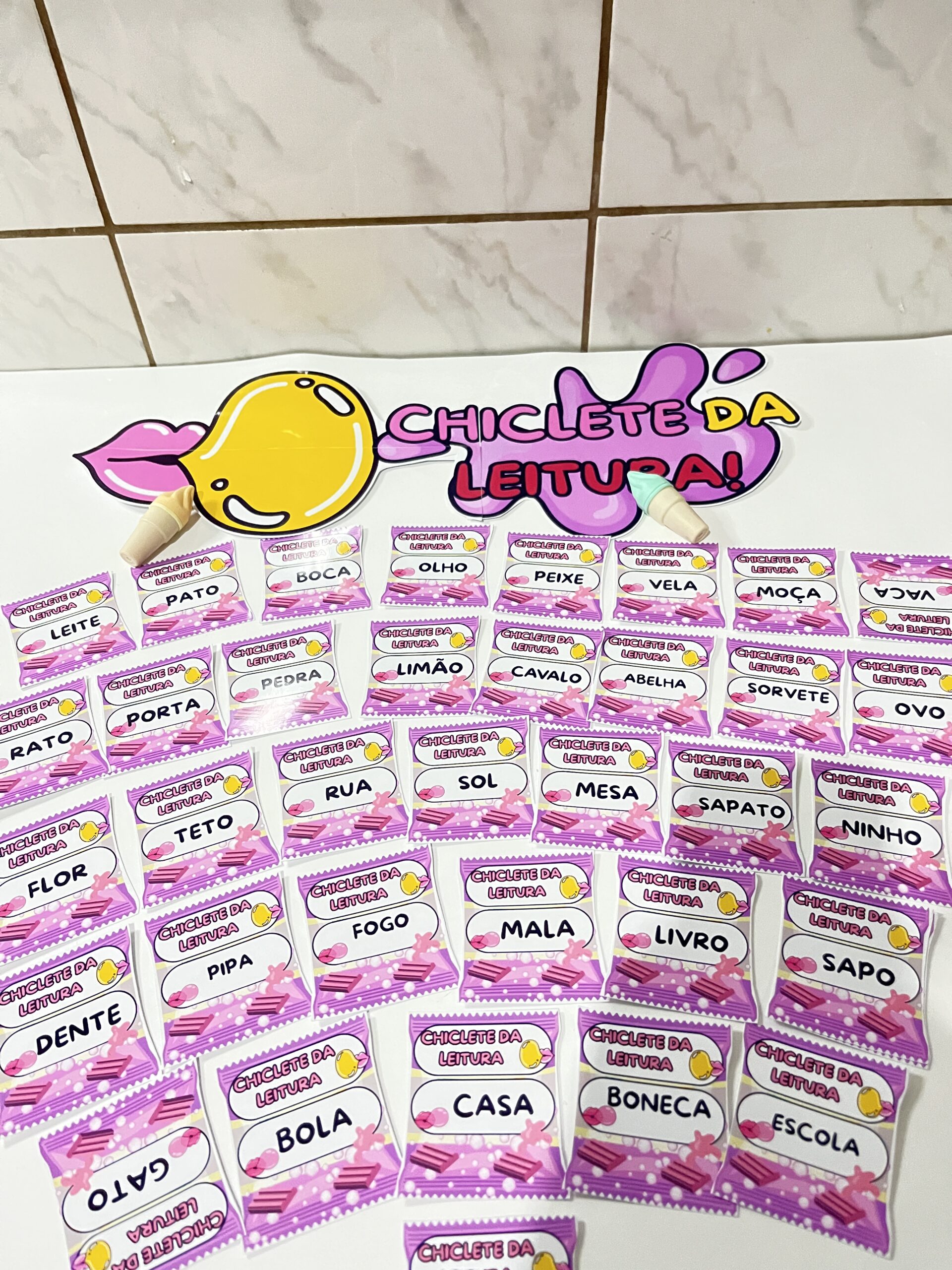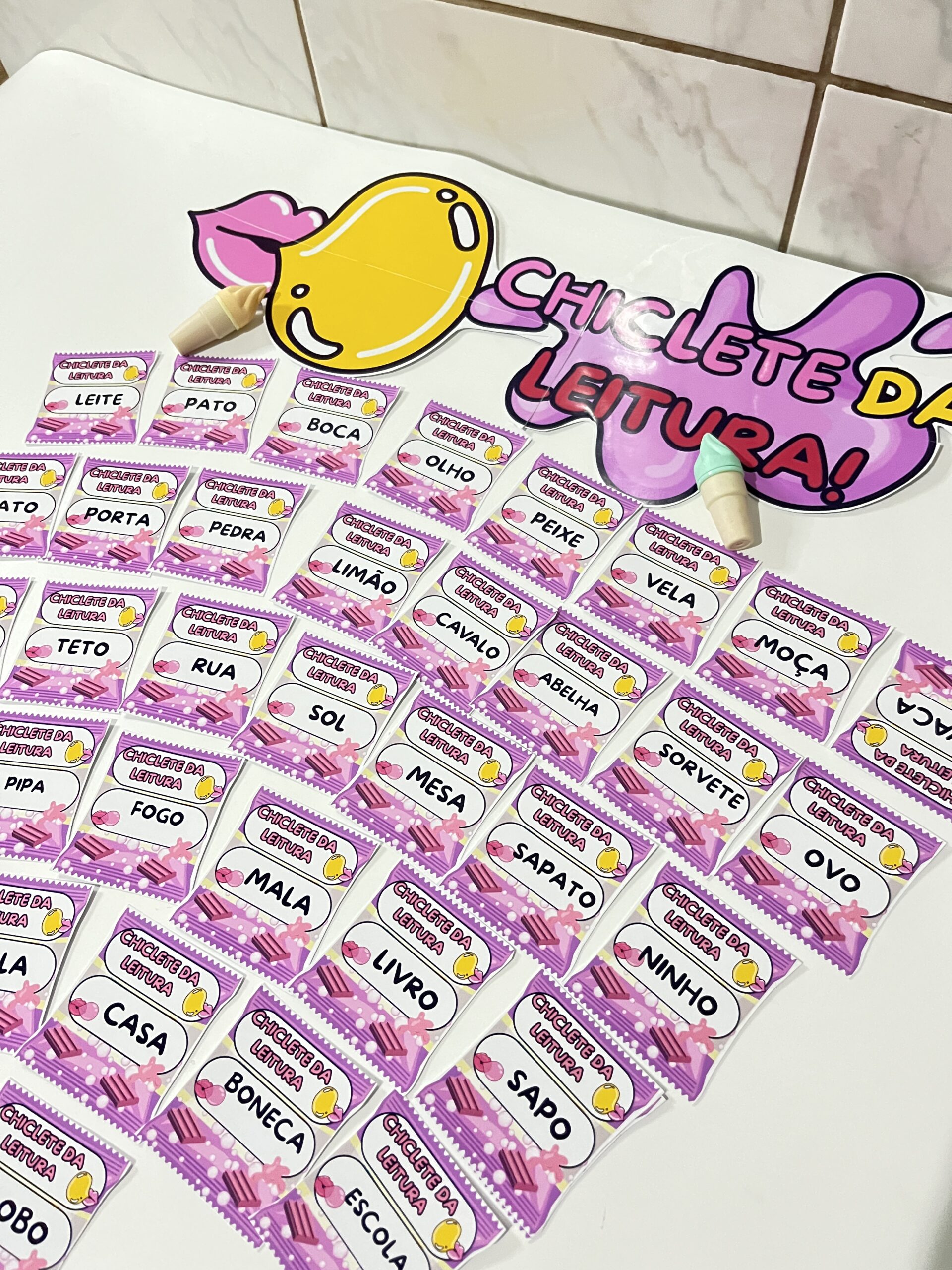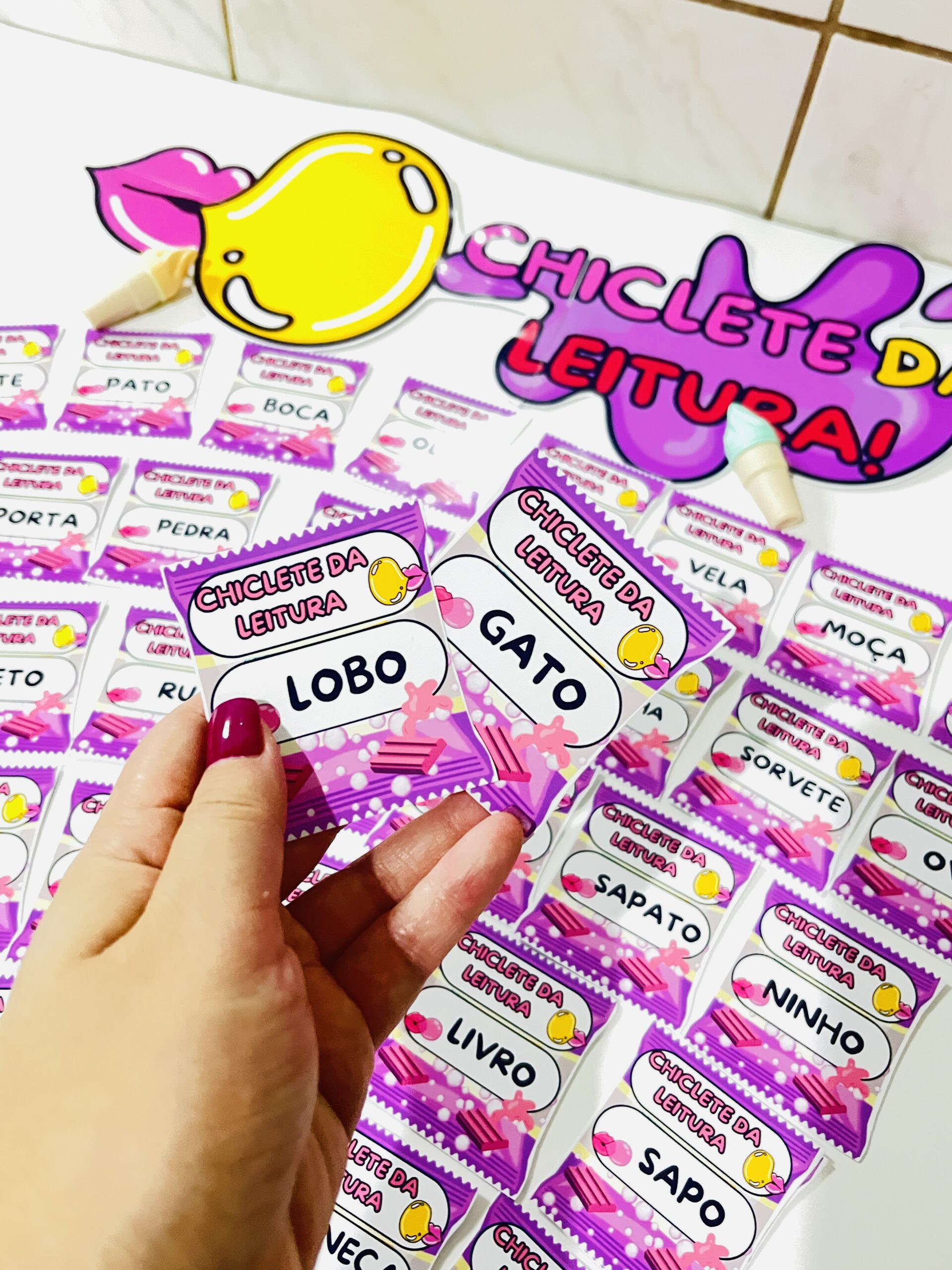 O Chiclete da Leitura é um arquivo pedagógico criativo com 30 palavrinhas essenciais, cada uma apresentada em um chiclete colorido, pensado para encantar, motivar e estimular a leitura das crianças 🌈