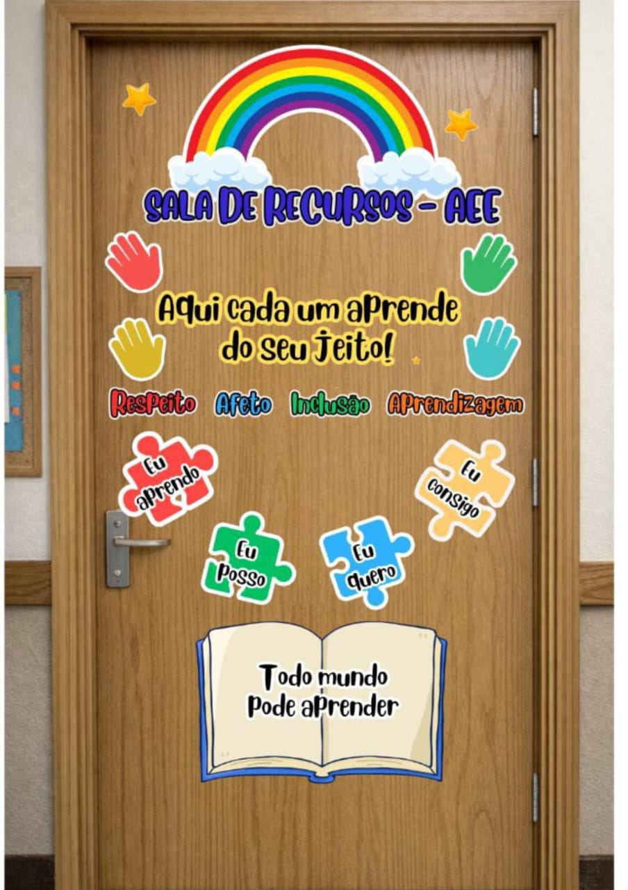 O Painel de Porta – Sala de Recursos AEE foi criado para deixar o ambiente mais colorido, inclusivo e cheio de significado, reforçando uma mensagem essencial: