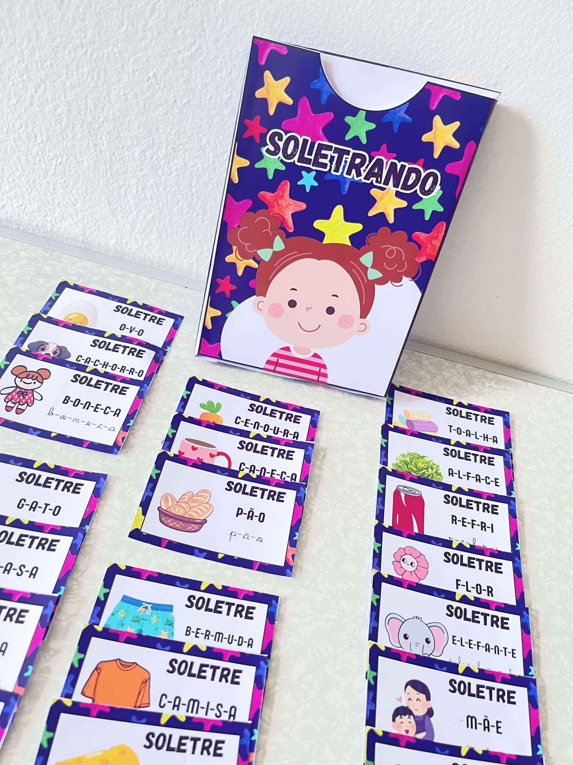“Transforme o aprendizado da escrita em diversão! Nosso jogo de soletrar com 24 fichas traz palavras simples e complexas em letras cursivas e de bastão. Ideal para desenvolver a leitura e escrita de forma lúdica e envolvente, perfeito para crianças em fase de alfabetização.”